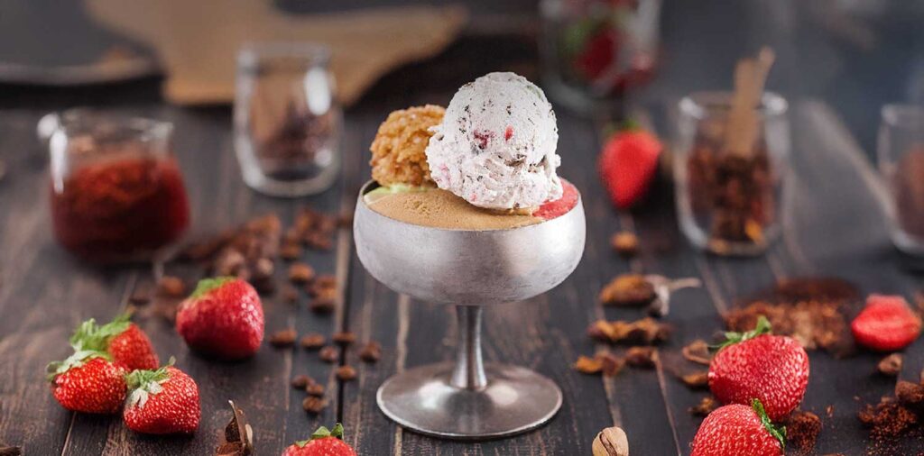 Moka, pistache, fraise, pain de Savoie, chantilly aux fruits confits