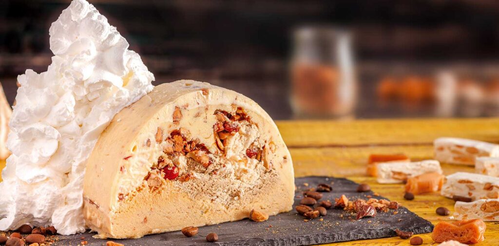 Nougat, caramel, praliné, parfait café, amandes caramélisées et meringues